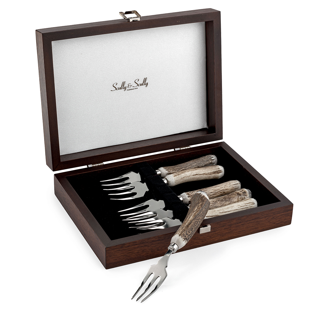 Coming in sets of six, staghorn cutlery brings the hardiness and warmth of the English countryside to your hosting scenes. Naturally-shed Indian stag horns are used for the handles of these steak knives, forks, spoons and carving sets. Made in England by an artisanal family company for another traditional family company, Scully & Scully, this seasonal cutlery is one-of-a-kind.