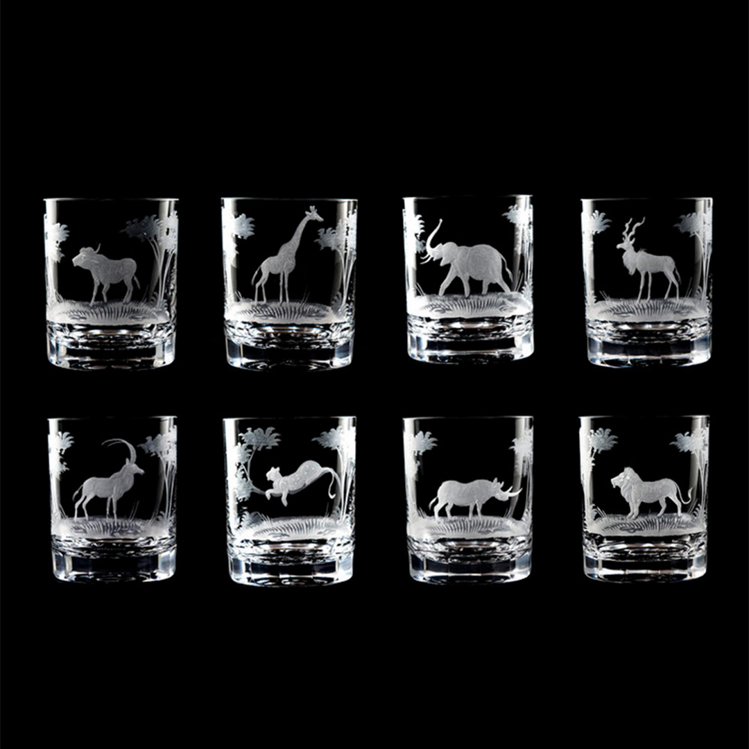 Queen Lace crystal, which is entirely handcrafted in Germany, is renowned for its unique glassware honoring the mystical world of wildlife. If you’re a travel lover, their dreamy collection featuring African animals is sure to bring a smile to your face. With these glasses, giraffes and antelopes can prance along your bar, adding a sense of whimsy and personality. Some guests may even ask to have a glass depicting their favorite species, including rulers of the African Savanna like lions, elephants, and leopards.