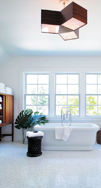 A mid-century-modern writing desk by Lovig equipped with a small domed reading lamp, a rare Hans Wegner cabinet stacked with terry-cloth towels, and vintage Herman Miller pendant light fixtures are what make this master bath, as David Kleinberg emphasizes, “in fact, a room.” Turning a bathroom into a real room of the house is not an easy task, but in addition to being spa-like, this light-filled space is an inviting retreat for writing and reading and truly relaxing.