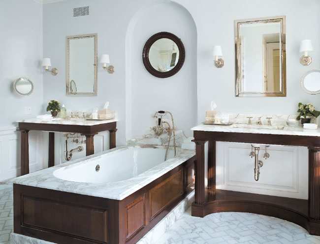 Designer James Michael Howard knows how easily a bathroom can fall prey to becoming a cliché of predictable motifs and materials. As he says, “Baths require and must embody the best craftsmanship to really sing.” This master bath hits all the right notes with features that include a herringbone floor, rich dark trim, and a simply executed notched arch that sets the tub apart from the rest of the room and smartly separates the two vanities. “The use of materials and patterns is very elegant,” says judge Kerry Delrose. “This is a really well thought out space.”