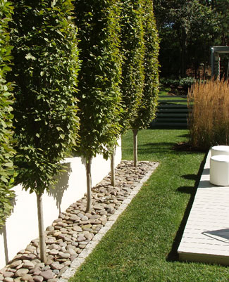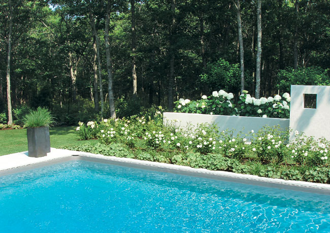 This small wooded lot in East Hampton was thickly populated with trees, and local laws severely limited the amount of clearing that could be done, so landscape designer R. G. Shuster pruned the trees in such a way as to bring in welcome light. The homeowners had also requested an abundance of flowering plants year-round, but nothing too “fussy”; a “comfortable modern style” without anything too minimal-looking; and privacy and immediate access to the garden. Stucco retaining walls were built to establish a strong relationship between house and garden, including a notched sculptural retaining wall above the pool that hides equipment. Judge Deborah Berke praises this project’s “wonderful use of white flowering plants and pale gravel for a sophisticated, monochrome garden design.”
