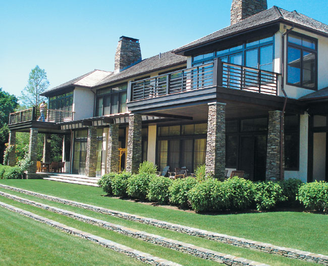 A long, narrow lot—110 feet wide by 950 feet deep—required the careful positioning of garden and leisure-time elements so that each serves its purpose without interfering with the others. Spaulding Landscape Architects planted a dreamy grove of native cedars and white spruce at the south end for screening, while native cedars and holly provide additional screening from the road. A limestone terrace follows the entire width of the rear of the house, a material that manages to stay cool even during the hottest summer days. The separate garage and guesthouse frame an entry courtyard, from which an inviting sinuous pathway, lined with 30 varieties of perennials, leads to the spacious main lawn, expansive enough to accommodate tented parties. Soil removed to fashion a sunken tennis court was ingeniously used to elevate the main house to the required flood elevation—a “very smart move,” says judge Scott Sanders.
