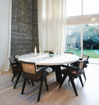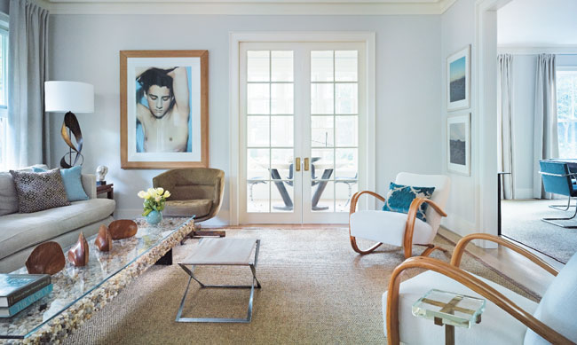 Both the client and Form Architecture + Interiors wanted to make a collection of paintings, photographs, and drawings the focal point of the decor in this new home on a historic Sag Harbor block. The most novel and exciting example of this direction appears in a corner dining area, where a minimalist geometric work is hung against a multi-paned wall of windows. A crisp, stripped-down version of traditional molding was added throughout to keep the interiors humble but equally fresh and animated, and the first floor, noted for its tall ceilings and floor-to-ceiling windows, has an especially airy, loft-like feel. As judge Deborah Berke says, part of the success of this design scheme depends on “a sense of humor about scale, which is delightful.”