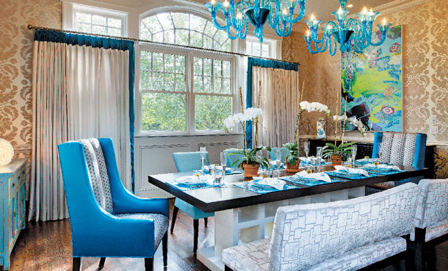 This house in Westhampton Beach is full of colorful surprises. The dining room is graced with a pair of pretty blue Murano glass chandeliers that cast a distinctive light, a guest bedroom features a boldly patterned cinnabar-red wall, the beds in another guest bedroom are fitted with an exuberantly striped headboard, and the small sitting room focuses on a dramatically sculpted neo-Renaissance fireplace. By imbuing each space with captivating details, layered textures, and a playful color palette, the Design Studio has created a house with a “youthful exuberance to it,” says judge Sherrill Canet, “yet it is extremely sophisticated at the same time.”