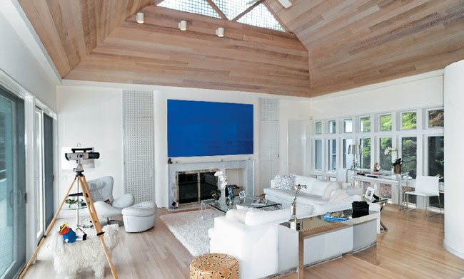 As all Hamptons designers know, it’s hard to compete with the ocean. Susanne Kelley’s mandate while decorating this waterfront house in East Hampton was to celebrate the views while giving character to the combined living and dining rooms. The client requested an all-white interior, so Kelley carefully introduced small moments of drama into the large-windowed, sky-lit space, starting with an enormous photograph of the ocean by Robert Bery above the fireplace. The intense blue echoes the surf outside while introducing a beautiful burst of color into the otherwise largely monochromatic space. A glass sculpture and side table and a Lucite coffee table further underscore Kelley’s clarity of vision.