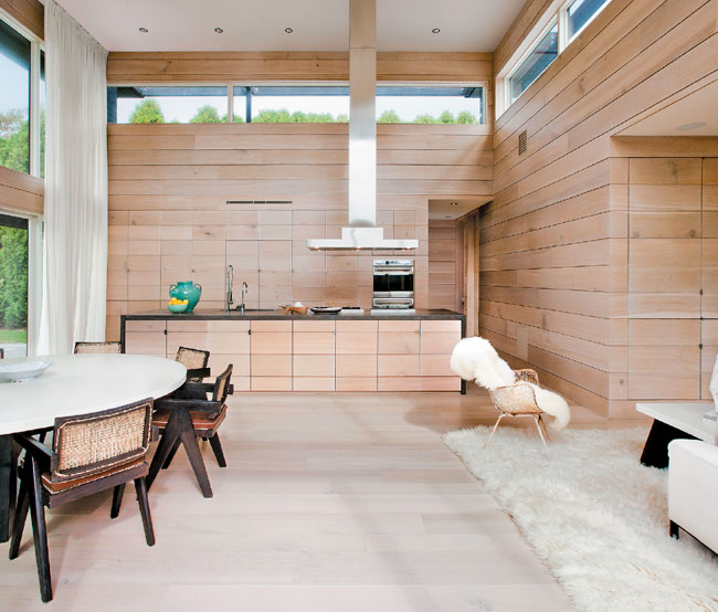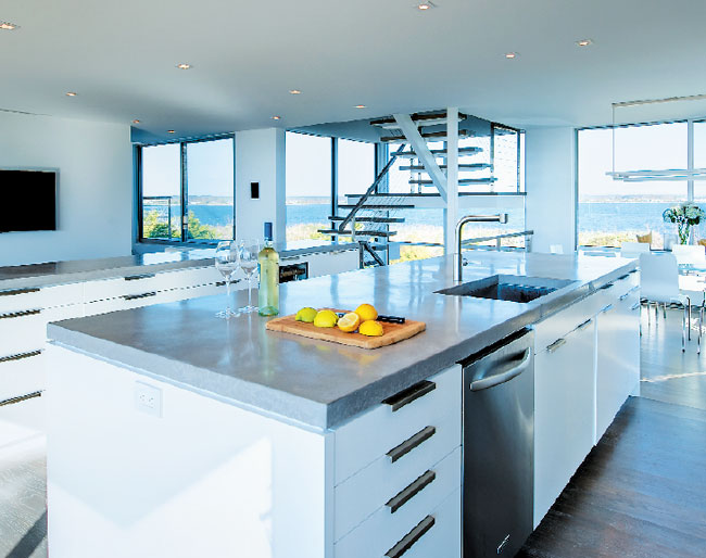 When a room comes ready-made with expansive views of both ocean and bay, no kitchen appliance should ever get in the way. Stelle Architects’ solution for this project in Bridgehampton was to keep everything in the room simple—from polished concrete to custom matte-lacquer cabinets, light-gray oak plank flooring, brushed-metal appliances, and a nearly transparent staircase. By melding the dining and sitting areas into one, the kitchen functions as the central hub of the house, a place from which the homeowners can follow the natural light throughout the day.