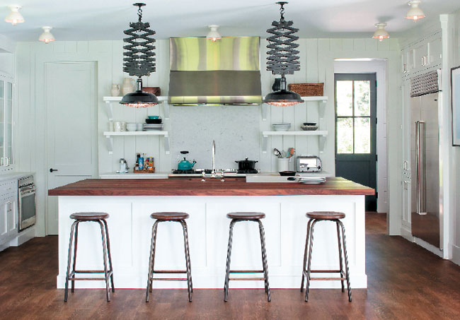 In designing a space meant to have the feel of a cozy cottage-style kitchen—but one infused with natural light and generous open shelving—Daniel B. Scotti incorporated a decisive focal point: a pair of vintage European industrial light fixtures. “I knew these fixtures would be perfect for the space,” he says, “not only for their texture and color, but also because they provide just the right amount of visual weight without blocking any light.” Nothing is predictable in this Wainscott kitchen—from the custom-milled tongue-and-groove boards to the Carrara marble and oiled walnut work surfaces. “Simple, clean, charming,” comments judge Deborah Berke. “A traditional kitchen that’s neither fusty nor cloying.”