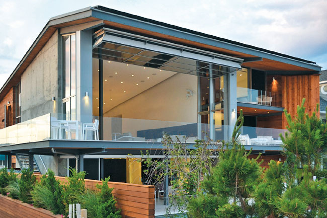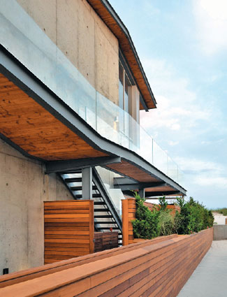 It’s what every house aspires to be: “A place one would never want to leave,” which is how judge Sherrill Canet responds to this residence by West Chin Architect. Like some magical structure plopped mysteriously at the shore, the house appears to float above the ground while simultaneously sloping toward the ocean, so that even the most deeply recessed rooms have an unobstructed view. Indeed, it’s sometimes difficult to tell whether you’re indoors or out, particularly when the 26-foot-wide hangar door is opened to the elements. Not just statement-making, the house comprises environmentally sensitive materials like laminated lumber and solar roof panels. The latter efficiently collect, radiate, and disperse heat, but judge Scott Sanders insists that the house is “very cool.”