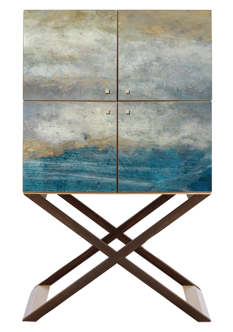 First shown at Salone 2016, Armani Casa’s Club bar cart was made in limited production (only 50 available) with each piece numbered and signed. The front of the rustic unit is decorated in a hand-varnished “ocean” lacquer, while the remaining structure is covered in a pearl, gold fabric. Inside, three drawers and a removable countertop offer ease of access and space for mixing drinks. $65,000.