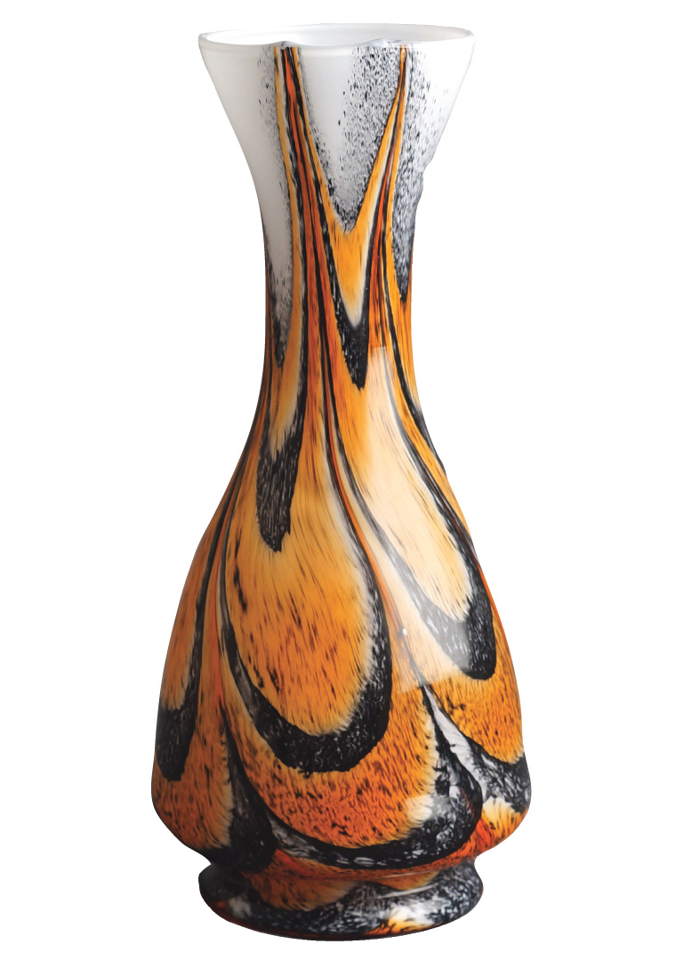 This colorful glass vessel, part of a collection dubbed the Internal Colorway Series, was crafted between 1965 and 1975 in or around the town of Empoli, Italy, known for its iconic glasswork. The rare, graphic works are a prime example of the Empoli glasshouses’ skill and advancement from their earlier (circa 1927) works and are together as a collection for the first time since the ’60s. Price upon request, cultureobjects.com.