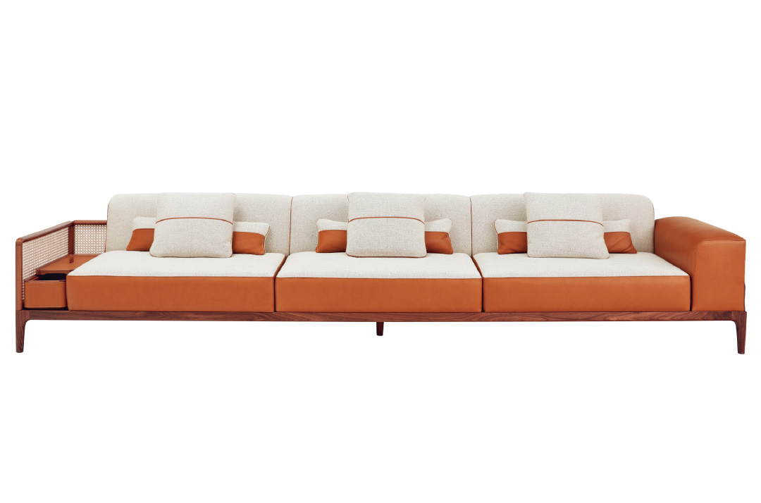 The Sellier sofa from Hermès’ latest home collection is a love letter of sorts to the brand’s origins, as its mastery of cabinetmaking, upholstery and caning are seen throughout: A caned screen on one end of the sofa shelters a leather-covered box for the owner’s convenience, while saddlebags on the side of the armrest and hidden pockets and compartments provide additional storage. $69,000.