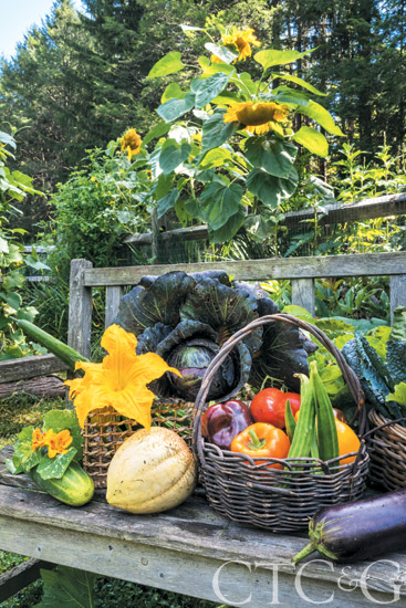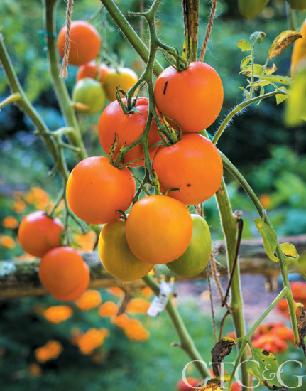 Trellises designed by Igor Jozsa were constructed from cedar sourced from the property. The chicken coop is an original design by architect Janet Cross. The yellow and red marigolds bordering the trellis are Queen Sophia and match the yellow and red tomato varieties (Kellogg’s Breakfast and Roman Candle) growing on the trellises