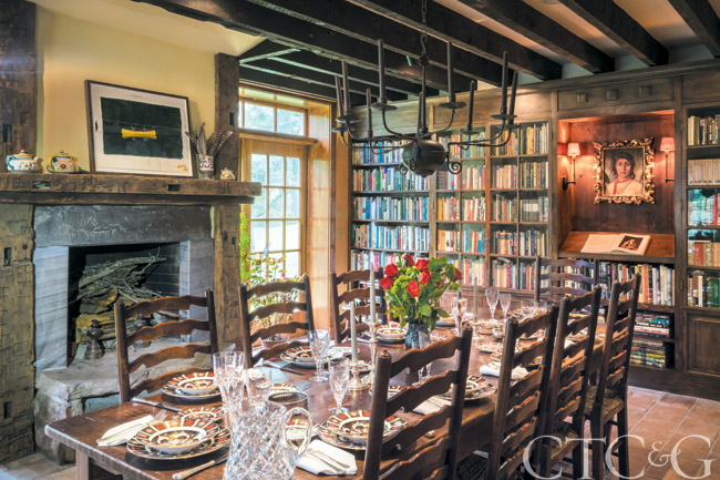 English ladder-back chairs from Royal Antiques in New Orleans surround a custom table made from repurposed New Orleans barge-board wood from 150-plus-year-old barges. Old Imari china is by Royal Crown Derby.
