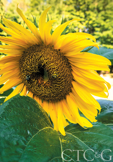 Mammoth sunflowers gaze down upon baskets of fresh veggies.