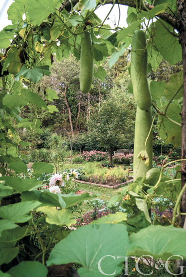 The vine growing on the Better Barns garden shed is an heirloom pumpkin called Musque de Provence—a mainstay in the south of France, it produces 10- to 20-pound pumpkins with an unusual floral taste.