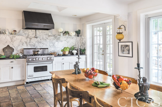 An antique kitchen table is surrounded by French early 20th-century chairs from Conran’s. The backsplash behind the Viking stove is made of statuary marble; countertops are black granite.