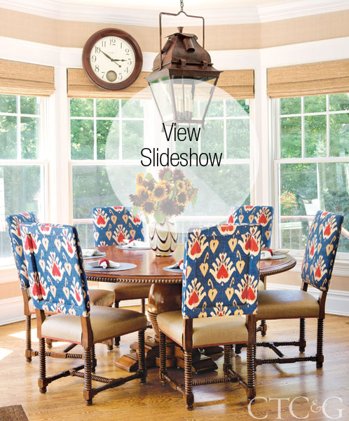 While the furnishings, carpets and draperies make design statements, another element stands out: vibrantly hued glass vases and vessels, most of them chosen by Damon Crain, Eason’s husband, a noted dealer in decorative accessories. In every room throughout the home, family heirlooms and ancestral portraits are carefully integrated with newer furnishings and accessories. “The house tells the tale of what this family’s lives are all about, where they’ve been, where they’re going,” says Eason. “It’s about a life well-lived, about being patriotic and about giving back.”