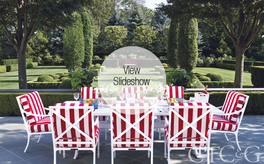 One of Morgan’s favorite spots is the downstairs powder room with its red-on-white wall covering and a sign to the right of the mirror, Sunshine. Similarly, in the kitchen, another sign—EAT—captures the couple’s love for entertaining. The palette carries over to the dining terrace, where McKinnon Harris furniture sports a red-and-white striped Dedar fabric, which ties seamlessly back to Doyle’s red bench. “Can you imagine a more beautiful setting?” says Morgan. “It could be anywhere in the world.”