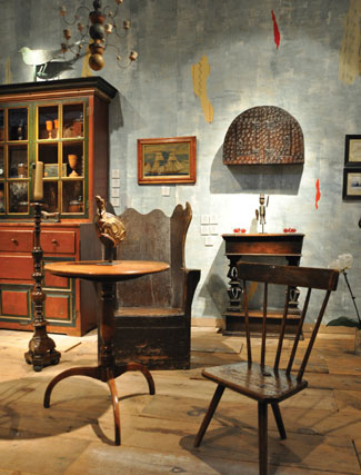 The booth of Robert Young Antiques (London, England, robertyoungantiques.com) was particularly colorful. A hand-painted wall had pieces of wallpaper peeking through layers of blue wash as if to suggest one had just walked into an English cottage. A small-domed cabinet from Wales, circa 1650, hung on the wall; on its surface was a randomly carved pattern of bull’s-eye markings punctuated with hand-wrought butterfly hinges.