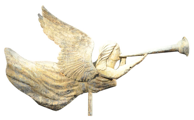 And yet I was drawn to several pieces because they seemed to herald the coming of a much-anticipated spring. As an example, a weathervane of molded copper from Fred Giampietro (153 Bradley St., New Haven, 203-787-3851, fredgiampietro.com) welcomed visitors to the show. Made in 1872 in Franklin, Ohio, the angel atop the vane retains a patina of verdigris with gold leaf. I imagined this seven-foot beauty proudly gracing a church steeple.
