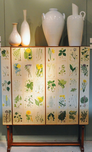 A Viennese cabinet on stand in the booth of Hostler Burrows (104 Franklin St., NYC, 212-343-0471, hostlerburrows.com) displayed sprigs of greenery on hand-colored bookplates. The circa-1940 piece is the work of Josef Frank. Kim Hostler described this “very Viennese” cabinet: “[Frank] was inspired by nature. It’s a study in bringing nature into the home, a necessity when living in northern climates.” I loved the lightness of the piece matched with the delicately rendered botanical prints and birch interior.