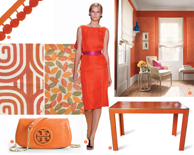 1. Dolce Pom Pom fringe from Samuel & Sons. samuelandsons.com. 2. Wavelength Collection Orange on Oyster by Alan Campbell. quadrillefabrics.com. 3. Mystic Leaf Orange Rug by Liora Manné. lioramanne.com. 4. Room in Island Brights Hot Orange (IB67) for Ralph Lauren Paint. ralphlaurenpaint.com. 5. Gracie Ming Style Table with crackle cashew lacquer finish. graciestudio.com. 6. Hibiscus Silk Faille Multifold Dress with Aster Korean Sash. carolinaherrera.com. 7. Amanda Mini Logo Clutch in Blood Orange by Tory Burch. toryburch.com.