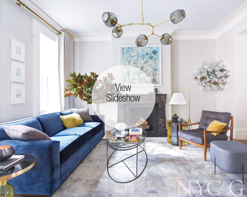 Decorators Catherine Brophy and Erin Fearins, from CWB’s in-house design team, Fearins and Welch Interior Design, came on board next, with the goal of creating a sophisticated space that would simultaneously fulfill the needs of a couple with two children. But first, they needed to convince their clients that the majority of the furniture that had traveled with them from London just wouldn’t cut it. “Our challenge was to show them what their new home could be,” says Fearins, a former Nashvillian who joined the firm in 2005. She and Brophy guided the couple through New York’s design showrooms, shopping for sophisticated new furnishings such as a custom wool and silk living room rug from Patterson Flynn Martin. Its blue and gray hues, resembling clouds in a stormy sky, are further amplified by an A. Rudin sofa covered in a navy silk velvet.