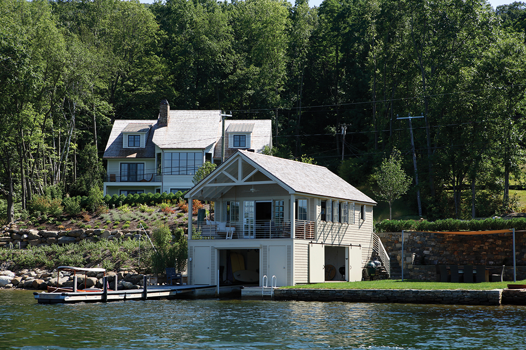 Lake Waramaug, in New Preston, is known for its grand old estates, some of them built by 19th-century architect Ehrick Rossiter. Newly constructed homes are so rare there’s currently just one on the market, a never-occupied, circa-2016 lake house, priced at $5,400,000. Designed to take in water views from every room, the stylish, three-story contemporary was built with state-of-the-art technology, including app-controlled HVAC, security and sound systems. The kitchen is especially well appointed with two Miele dishwashers, a six-burner Wolf cooktop and oven, a Sub-Zero fridge and a generous island. There’s also a lower-level mahogany bar with another dishwasher, adjacent to a 500 bottle-wine cellar. On the one-acre property: a deck along the water’s edge, a sandy swimming area and a lofty boathouse with a full kitchen, bath, sleeping area and dockage for two boats underneath. Peter Klemm of Klemm Real Estate has the listing.