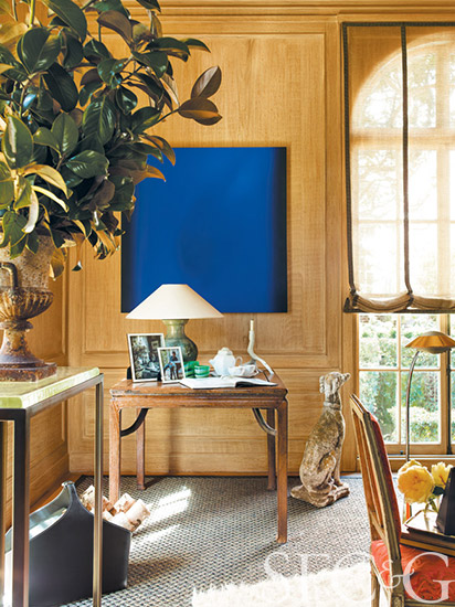 The music room by Michael Booth and Steve Henry of BAMO is tradition re-imagined. Here, heirlooms meet the 21st century: An acrylic Alexandra Von Furstenberg console table pairs with a antique settee covered in silk satin; an iconic Gerrit Rietveld chair partners with a 19th-century French Bouillotte table lamp; and contemporary works by Marc Katano, Laurie Reid and Ruth Pastine bring modern pop to traditional wood paneling. Although it has elements of formality, the music room is ultimately a space for expression.