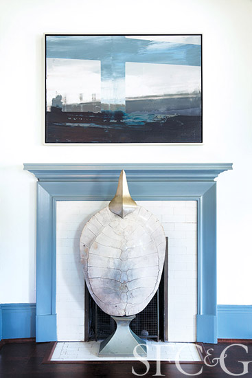 By conjuring the atmosphere of the Bay, Melanie Coddington created a serene, luminous bedroom. Showcased against the backdrop of the blue-gray palette are pieces that reflect the designer’s feminine-but-modern sensibility, including a custom sea-blue mohair velvet bed, an antique olivewood Rococo-style commode, and a stunning 19th-century albino tortoise shell.
