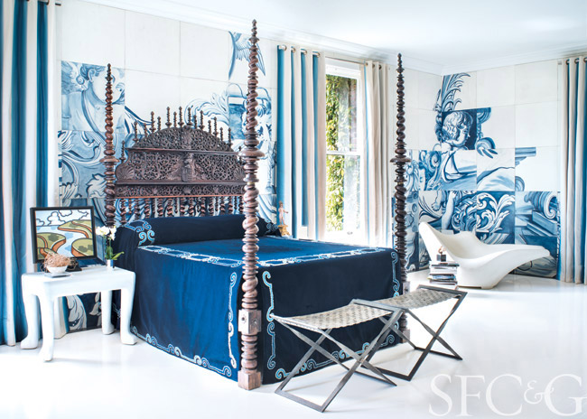 Antonio Martins’s masterful homage to his heritage was inspired by a Portuguese Bilros bed that has been in his family since the 17th century. Giving the piece pride of place, Martins extended his ancestral approach to the walls, covering them in 243 blue and white Azulejos, traditional Portuguese tiles that were hand-painted by San Francisco artists Linda Horning and Katherine Jacobus. The result is an unforgettable space that adds a new chapter to Martins’s family legacy.
