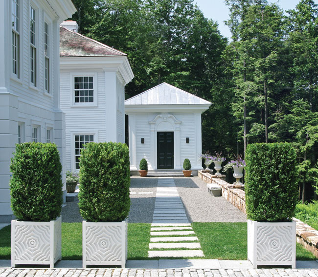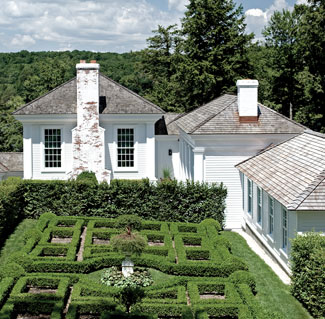 The formal garden has been designed as a series of boxwood parterres, which are terraced up the back slope behind the house. These give the space year-round structure, and with the evergreen pine trees in front, Couturier’s garden manages to transcend the seasons.