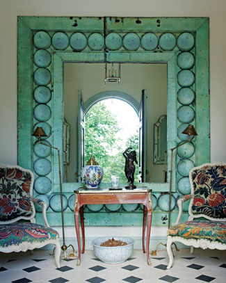 decorated with early English furniture surrounding a large, broad fireplace. Upstairs, Couturier has created a 19-foot-high formal salon with priceless pieces of furniture, including a French Louis XIV lit, which is overlooked by a magnificent seventeenth-century portrait of Lady Elizabeth Dormer by Gilbert Jackson. Scattered around the room are a pair of low benches by Jean-Michel Frank, which serve as coffee tables, and one of his famous marquetry straw screens. In the corner sits an unusual eighteenth-century desk by cabinetmaker Canabas, while a huge seventeenth-century Alsatian armoire anchors the opposing wall.
