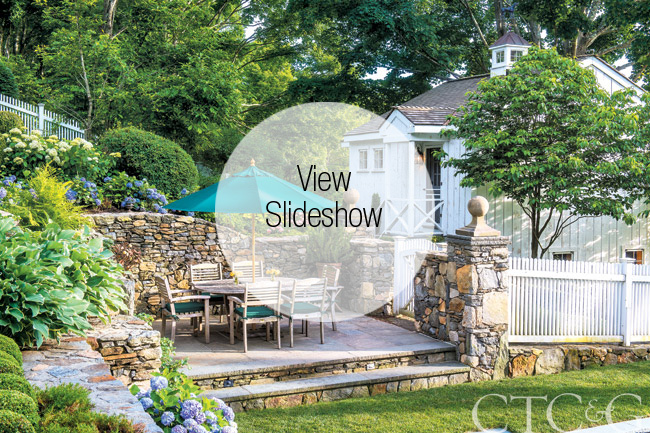 A built-in terrace of sorts already existed: A stone wall shouldered the hill, probably the remnants of a barn foundation. That wall—ensconced in climbing hydrangea—was used to back a mezzanine level above the pool wide enough to fit a line of lounge chairs. The reclining kickline enjoys a commanding view of the pool a couple of steps down, while New Dawn roses climb the wall below. From there, it was a matter of tucking in alcoves—each with its own purpose. A dining loge is large enough to contain a table and chairs with sufficient room to move around. And footholds were cut into a hillside for an orchard of kouza dogwoods. Tracey Young of the Elemental Garden in Woodbury furnished the antique finials and urns to serve as focal points while helping with the original layout. David Bergman of DWB Botanical Design helps implement Drendel’s vision, serving as horticultural expert and providing meticulous maintenance. He sculpts hedges of which Russell Page would approve: Razor-sharp, they etch curvaceous lines in the landscape, subtly telling your feet where to go.