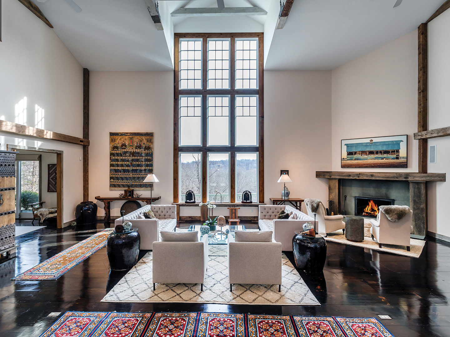 Merryall, a pretty enclave in New Milford, is the site of a sophisticated barn-style home, on 41 acres. One of the owners—who has serious design chops—led the renovation of the interiors, which center on a dramatic great room with a double-height window wall, a salvaged-wood framed fireplace, exposed beams and two staircases that join to create a balcony overlooking the room.