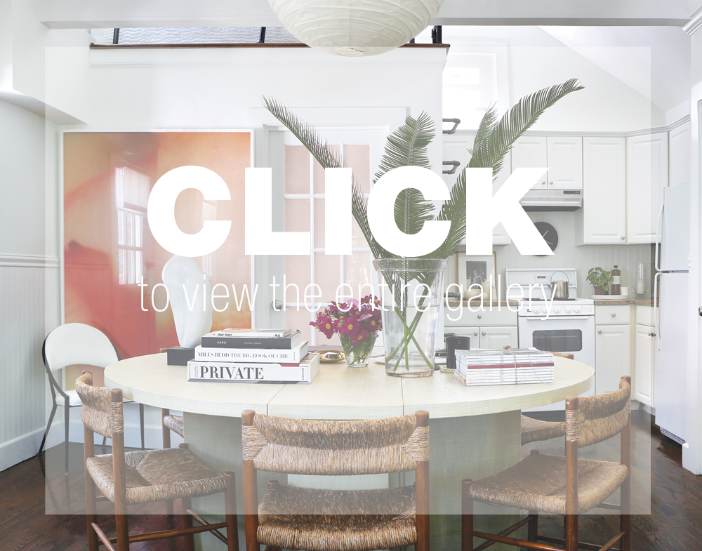 A decidedly modern aesthetic rules: A white paper Noguchi lightshade hangs above a dining surface, while the black steel fins of a Calderesque mobile rotate over the living room area. “Those two elements are the centerpieces that define the space as a whole,” notes the designer. To further create a loft-like feel to an otherwise traditionally styled cottage, Redding brought in a vintage glass and chrome coffee table that references a Mies van der Rohe design, a minimally articulated daybed by designer Darryl Carter, and white open-mesh metal chairs. Although the designer was careful not to break up the open space, she suggests different living functions through subtle cues: A zebra-skin rug defines a living area, a large round table establishes a dining space, and a vintage dresser fills a narrow alcove.