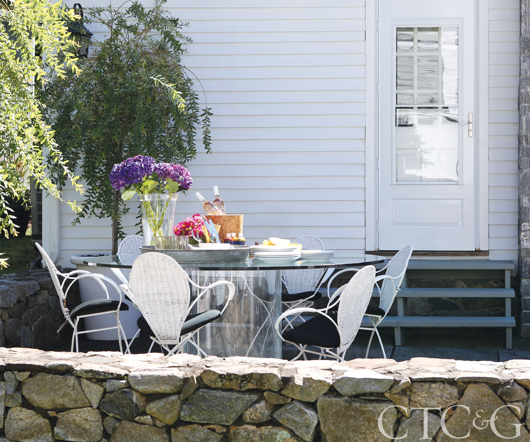 While Redding says the size of the one-room cottage is ideal for a single person, she feels fortunate to have two additional rooms to occupy—both outdoors. A dining patio, circumscribed by a stone wall typical of this part of Connecticut, is where she has alfresco meals with friends, while an adjacent sunken area is furnished as an outdoor living room. Her choices here include a Lucite table she had long ago bought for a client, who later sold it back to her. Years earlier, she had spotted armchairs at the Stamford Antiques Center that, to her dismay, had been sold to someone else. But they re-emerged in the center later. “It was meant to be that I would have them,” she notes.