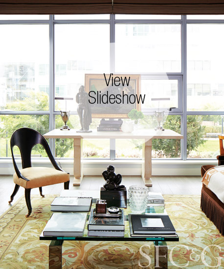 Instead of displaying them in a classical interior, Brady gave his provenanced possessions a streamlined backdrop in a new glass-and-steel apartment designed by Perkins & Will. “I love the juxtaposition of the contemporary architecture with my furniture and art,” says Brady. “It’s so clean lined that these pieces stand out much more than they would in a traditional environment.”