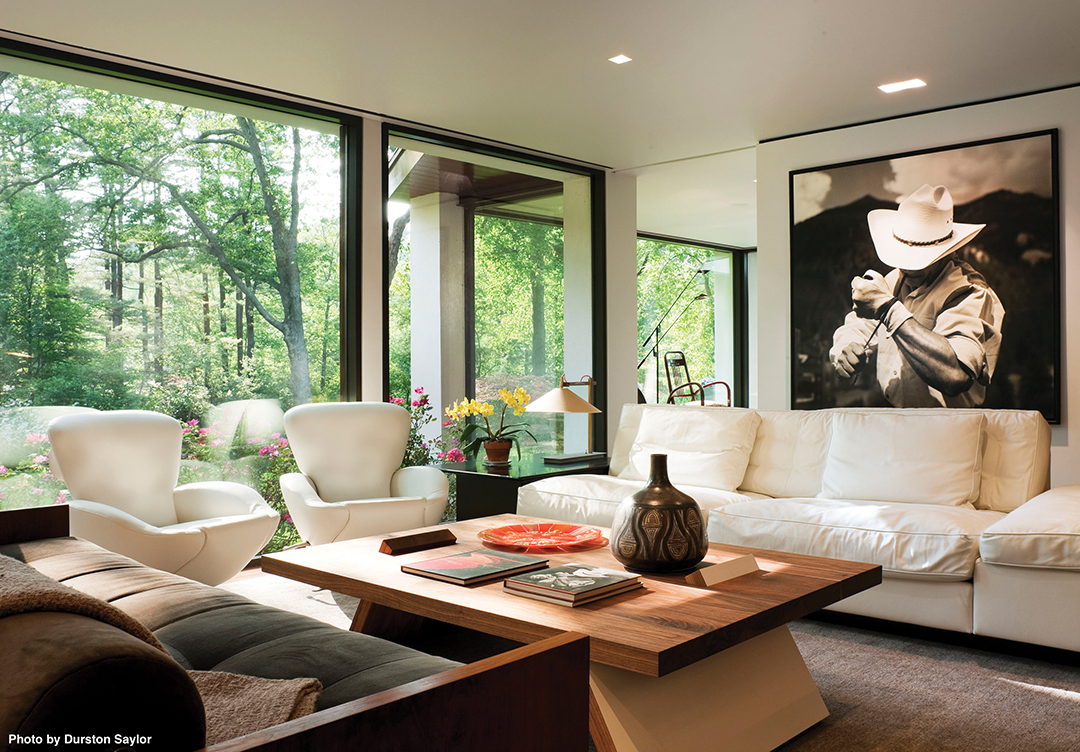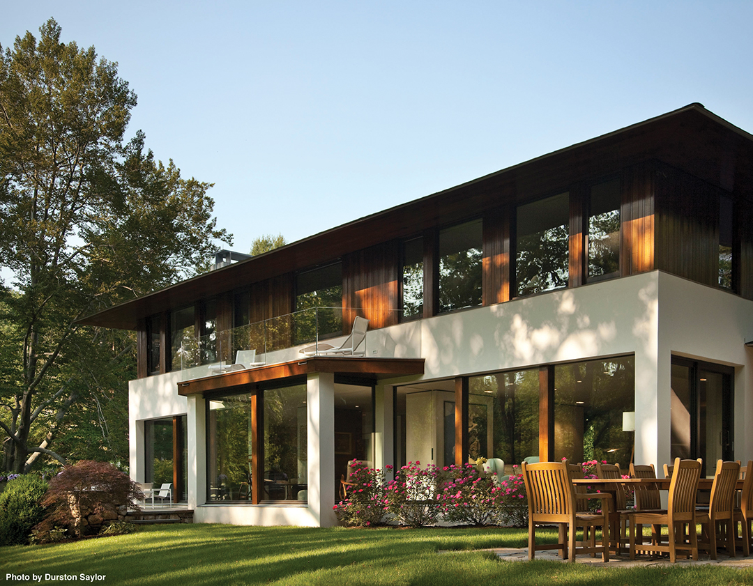 A New Canaan home built by architect Joeb Moore, which won both a 2012 IDA from CTC&G and a 2013 AIA award, is now up for sale. Those trophies are well deserved: The dwelling is distinguished by dramatic floor-to-ceiling glass walls and doors, designed to take in views of the private, natural setting, including lawns that roll down to a river and a pond with a hut perfectly suited for skating parties. The use of glass and wood continues throughout the 6,042-foot, open-plan interiors to a gorgeous effect.