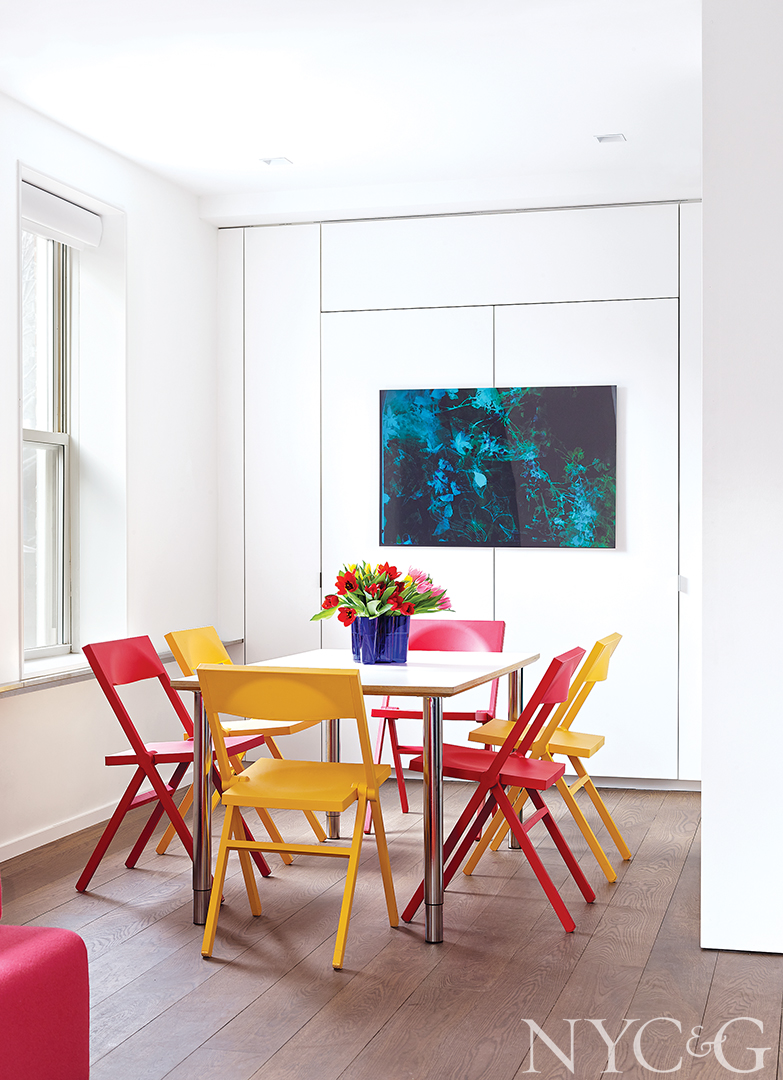 The neutral backdrop gets a colorful kick from seating pieces and textiles in shades of hot pink and primary red, yellow, and blue—similar to the vibrant hues found in Panero’s work. While bold by any account, it’s definitely not the kind of palette typically found on the risk-averse Upper East Side. “Lorenza wanted color to give the rooms character, making the apartment feel less like an art gallery and more like a residence,” Porter says. “It was refreshing to have a client who was so fearless.”