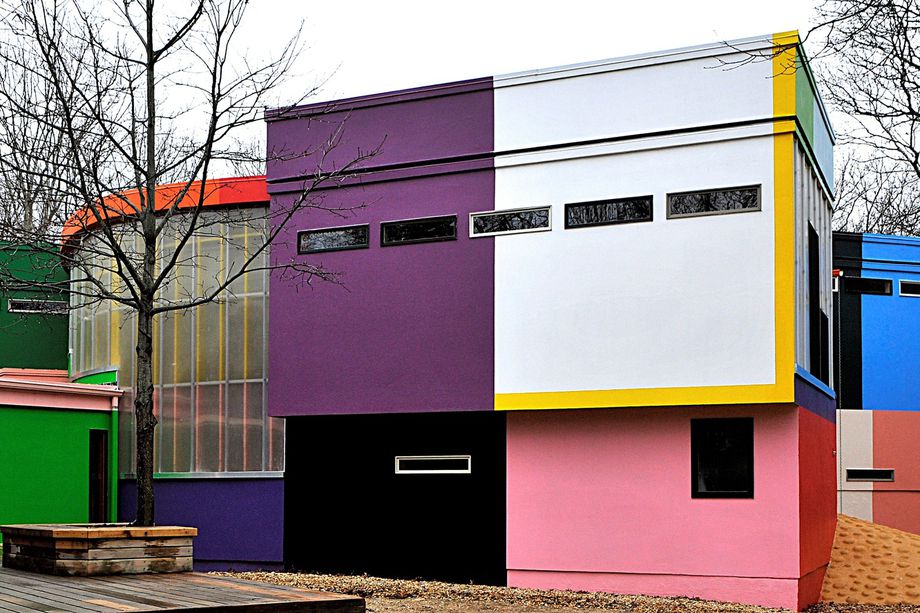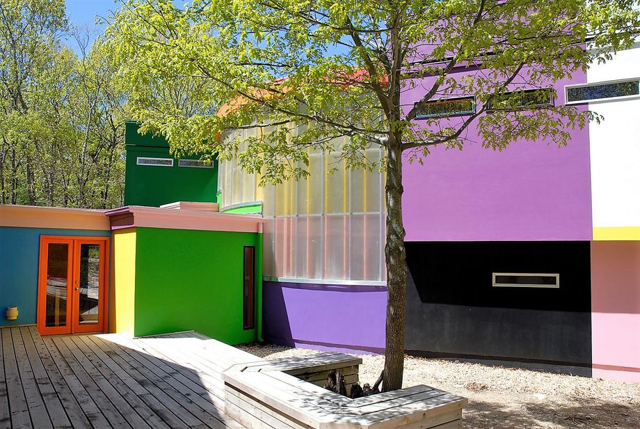 As for the house itself, it certainly has plenty of surprises in store. The original, front building, designed in 1960 by Carl Koch, was inspired by the Bauhaus and is a largely traditional living space. In this building’s 900-square-feet, there is a living room with fireplace, 2 bedrooms, and 1.5 bathrooms. Connected in rear and built in 1999, the Gins and Awakawa-designed addition finds inspiration in Cubist design and is painted 52 different colors. The space, home to an additional two bedrooms and one bathroom, sees Gins and Arakawa’s artistic vision in full-force; cubic volumes, small slopes, and Japanese rammed earth country floors. A property that is also a piece of fine art, the Bioscleave House is equal parts special and unusual.