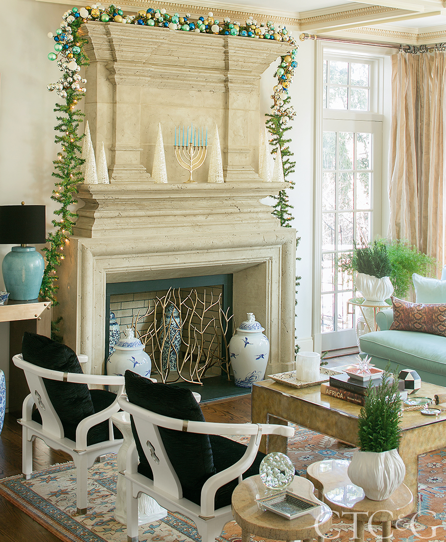 The luxe look carries over into the living room, whose white and cream palette serves as the perfect backdrop for a Parisian limestone fireplace. On the mantel, a grouping of white metal cone trees flank a silver menorah with blue candles, while a garland of twined blue, silver and gold balls cascades down the sides. Here, too, is the family’s Christmas tree, festooned with ornaments collected during their travels—“some fancy, some cheeky,” Ehrlich says. Among them, a red gondola on skis from Vail, an Eiffel Tower from Paris, and from Hershey Park, a s’mores set-up. “We decided that first year our tree would be a celebration of our lives together. Every year when it goes up, it is a wonderful walk down memory lane,” she adds.