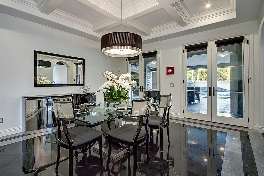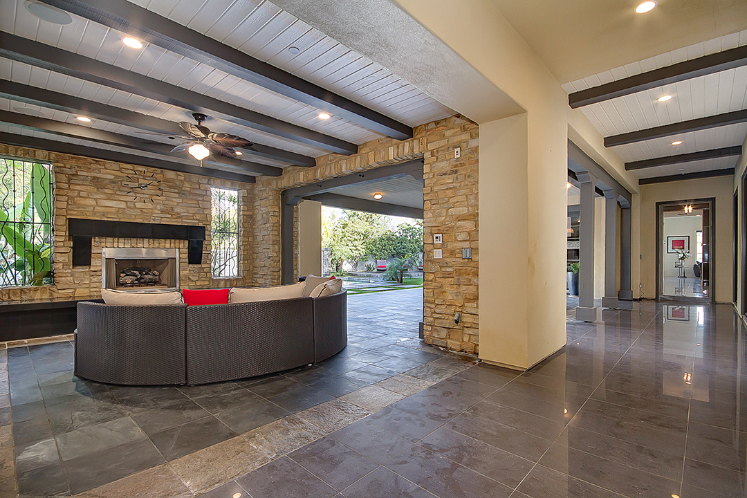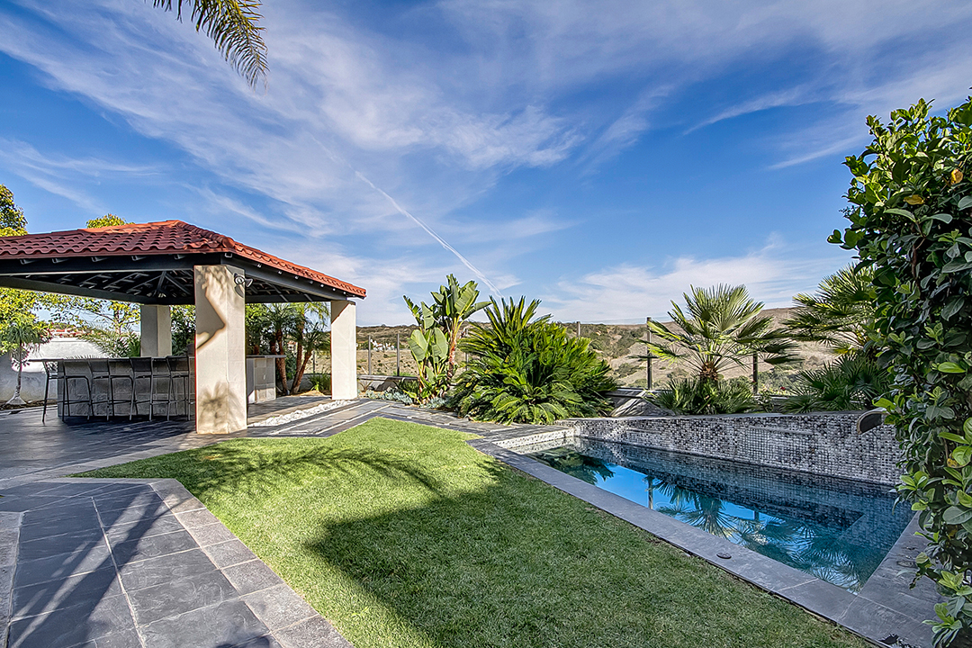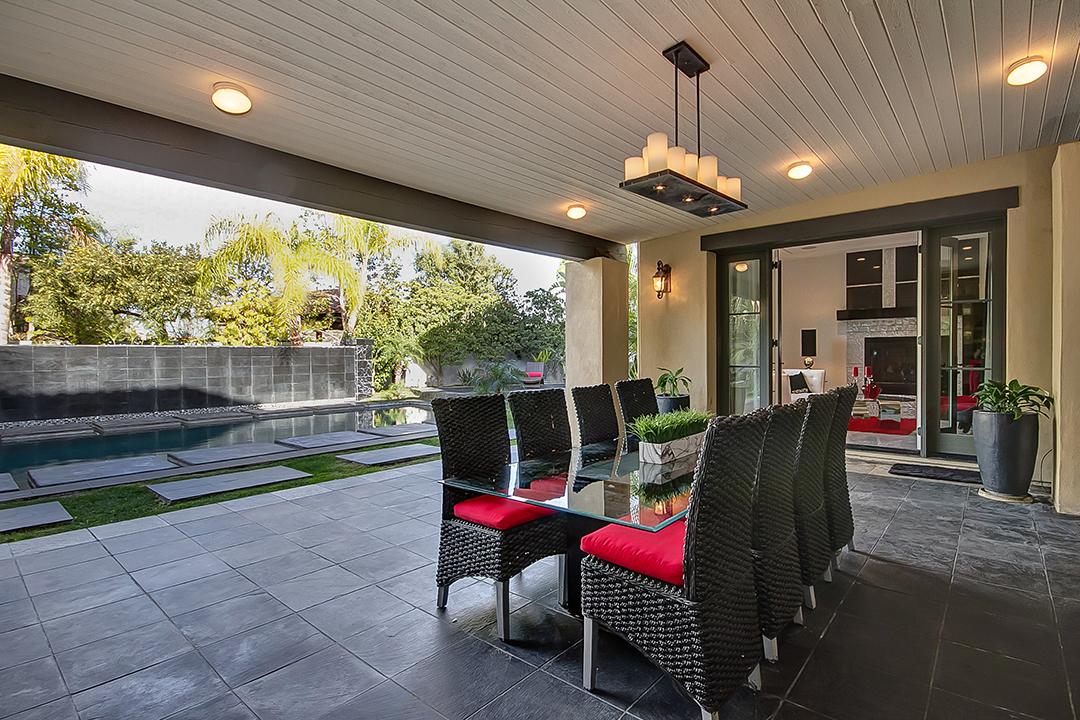 This West Coast home’s gracious spaces include five bedrooms, five bathrooms, a chef’s kitchen, a game room and more, but it’s the outdoor areas that really shine. When the sun’s out, there’s hardly any reason to come inside with an infinity pool, ample lounge chairs, a fire pit, a loggia with a built-in barbeque, a cabana, and a custom basketball court. The line between indoor and outdoor blurs under the expansive covered patio, which features an elegant dining area and a cozy living room with a fireplace.