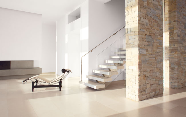 A chaise from Design Within Reach is positioned for optimal river viewing next to a streamlined gas fireplace with a gray granite surround by Wittus Fire by Design. The Porto beige slab floor tile is from Walker Zanger; the rift oak stair treads are from Finnryan Millwork.
