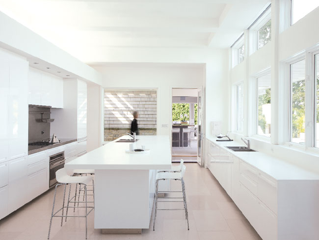 In the kitchen, the Wolf oven, six-burner cooktop, sink hardware, and cabinets are all from Boffi Soho; the custom rift oak countertops are by Finnryan Millwork. White laminate and chrome bar stools are from Ned Kelly and Co.