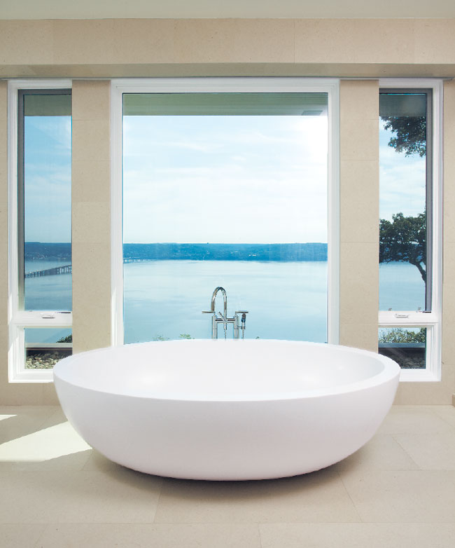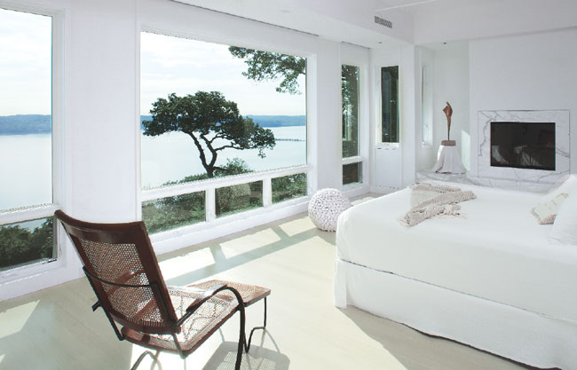In the master bath, both the floor-mounted white Corian tub and hardware are from Boffi Soho.