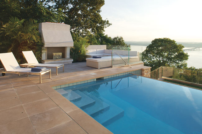 Architect Jo Machinist designed the vanishing-edge pool and the stucco fireplace, both of which were fabricated by Wagner Construction. The chaise longues and all-weather sofa are from Ned Kelly and Co. The pool and house overlook the Hudson River and the Tappan Zee Bridge to the northeast.