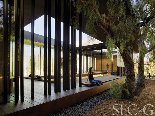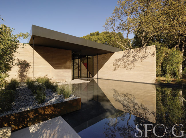 Inside, the minimally lit, minimally furnished space invites visitors to sit on benches or meditation cushions on the oak floor. Oliveira’s enormous artworks, particularly the 30-foot-long Diptych, depicting a pair of wings, are the most obvious focal points, but a grove of sprawling native oaks and a reflection pool, viewed through floor-to-ceiling glass walls, is a close second. The layout also encourages guests to walk outside into the courtyard, which is anchored by an understated cube of a fountain. “There was a tremendous opportunity to design for all the senses–visual, textural, acoustic,” says Aidlin. “Even the sense of smell comes into play, through the rammed earth and wood floors, benches and walls.”