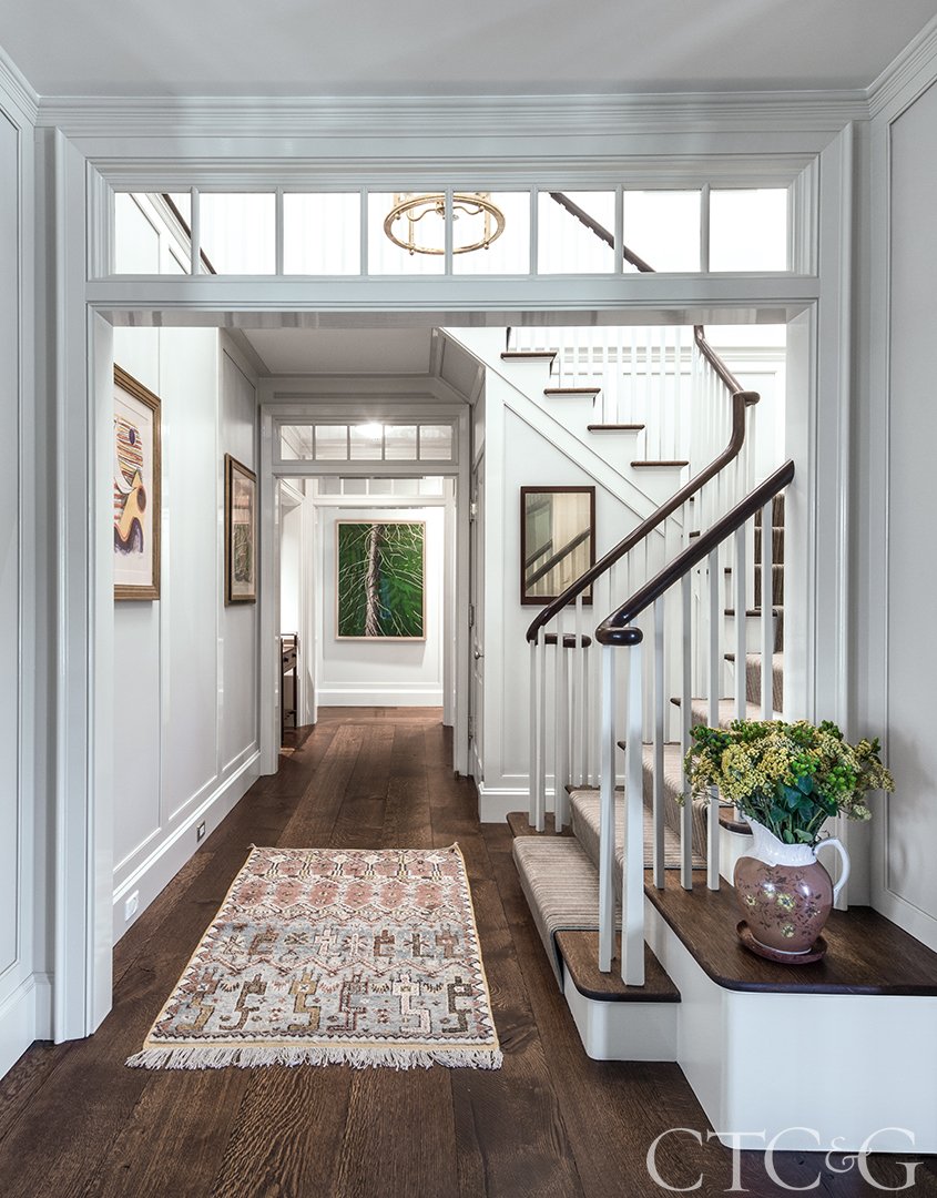 A Chinese rug now lies in the gambrel, custom shelving in the library accommodates the husband’s French literature collection, and an antique drop-leaf table and Chippendale chairs grace the formal dining room. The latter features a de Gournay scenic wallpaper. “Now even on a cold dark winter night, we can enjoy the woods and colors of the dawn,” says the wife.
