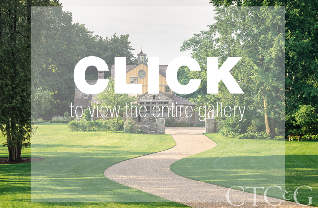Next, the existing main house was gutted, reconfigured and lifted to increase the ceiling height and add a second-floor master suite, and a Greek Revival-like building emerged. A gradual serpentine drive now wends past a refurbished barn and fields sweeping down to the pond before culminating in a courtyard where the main house, a new stone structure that houses the kitchen, and the garages come into view.